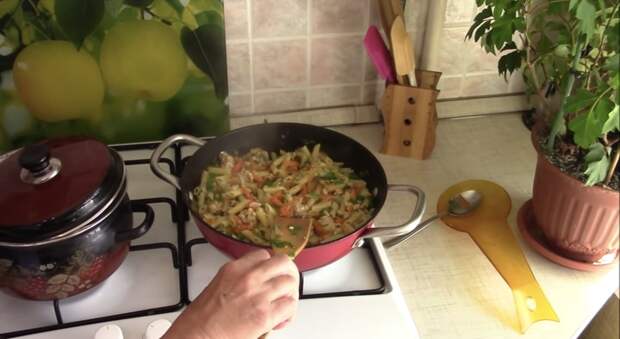 Обжарьте все вместе на растительном масле, изредка помешивая, на умеренном огне примерно 5-7 минут. Крышку держите закрытой.