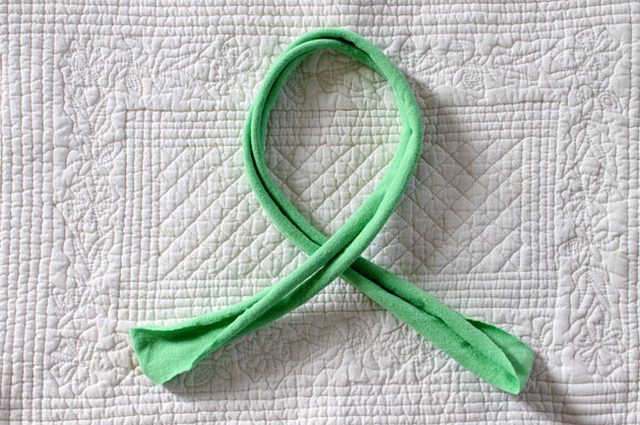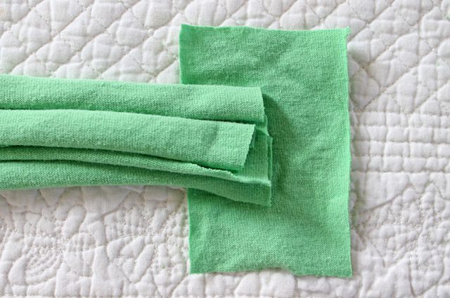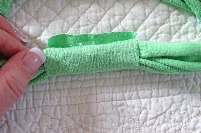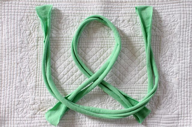 Примерьте узел на голове, чтобы отмерить нужную длину ободка, либо используйте сантиметровую ленту для замера. Приготовьте прямоугольник размером 6х9, вырезанный из футболки и положите на него концы ободка.