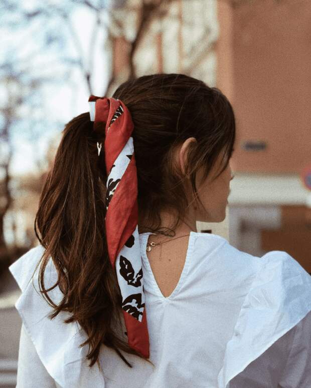 Еще одним стильным дополнением к образу станут шейные платки в волосах.