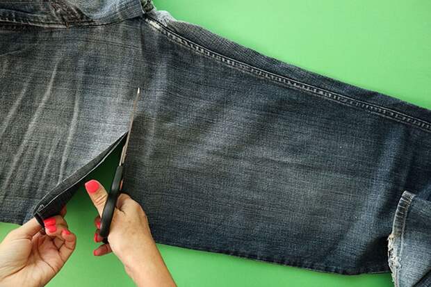 Удалите швы и разрежьте штанины на длинные полоски примерно 4 см шириной. С каждой детали получится около 3-5 полосок.
