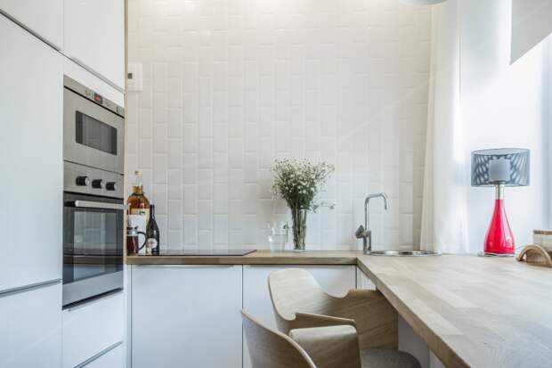 Предельная простота линий в кипенно-белой кухне с элементами неокрашенного дерева