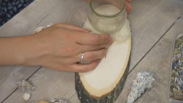 Прекрасная идея использовать ракушки, привезённые с моря, — сделать роскошный морской декор-подсвечник! Он украсит собой интерьер самым необыкновенным и прекрасным образом. Посмотрите, как легко его сделать! На спил дерева закрепляем баночку на горячий клей. Баночка не будет крепко держаться; если хотите приклеить «намертво», используйте эпоксидный клей.