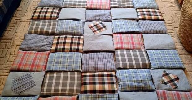 Сшитое своими руками лоскутное одеяло — вещь уникальная, по-настоящему ценная. Как показывает практика, люди предпочитают спать именно под одеялом, сшитым близким человеком, а не купленным в магазине! Сделайте уникальную вещь из старой одежды. Старые рубашки или любую другую одежду разрежьте на прямоугольники 28*20 см.