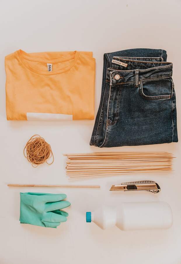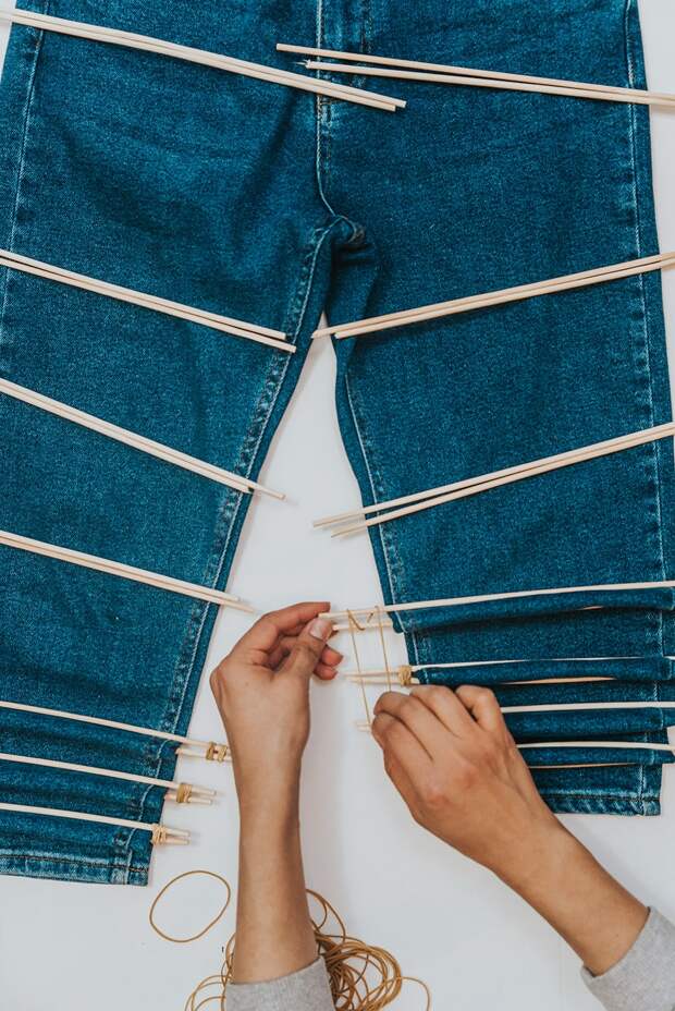 Разложите джинсы на ровной поверхности. Положите одну деревянную шпажку под штанину, а другую на нее. Таким образом получатся своеобразные волны на джинсах. Скрепите шпажки между собой с помощью резинок. Располагайте шпажки на таком расстоянии друг от друга, на котором вы хотите получить полосы на джинсах. Красиво будет смотреться вариант, когда в нижней части джинсов полоски будут идти более часто, чем в верхней.
