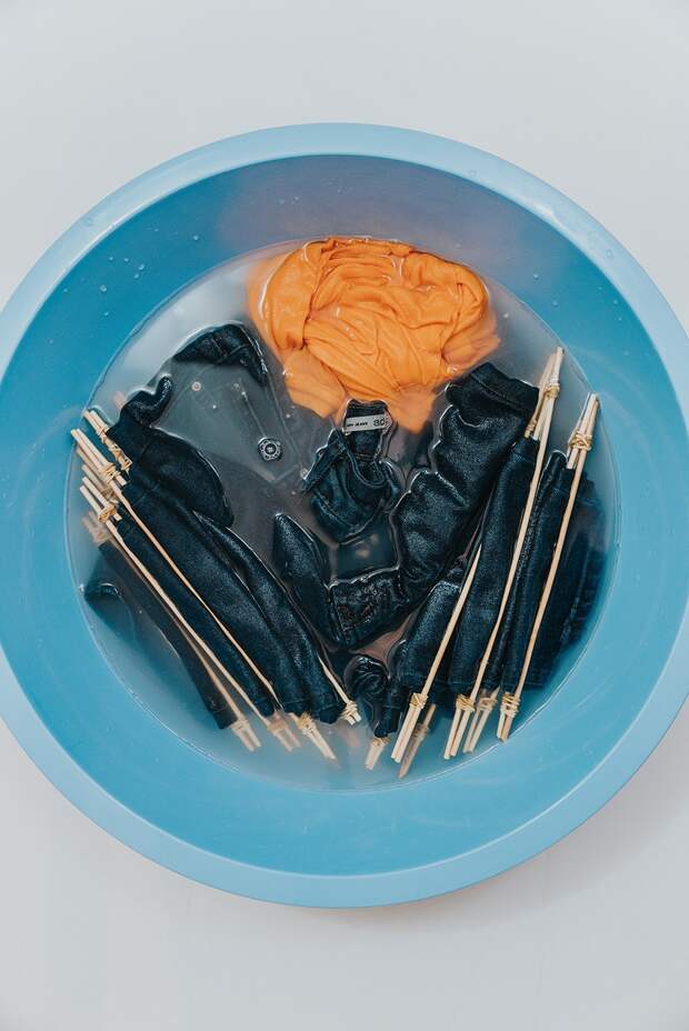 Положите джинсы в широкий таз. Действуйте аккуратно, чтобы не изменить положение шпажек и не испортить рисунок. Залейте джинсы отбеливателем. Работайте в перчатках, чтобы не испортить кожу на руках.