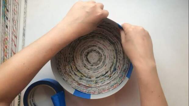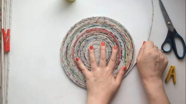 Накрутите из газеты трубочки с помощью спицы или палочки для суши. Закрутите трубочку в улитку, приклейте к ней следующую и таким образом сверните круг, попутно склеивая трубочки между собой. Вам понадобится два таких круга. Дополнительно нанесите клей ПВА по всей поверхности заготовок.