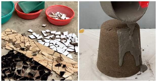 Если у вас осталась плитка после ремонта, пусть даже битая, используйте её для нового проекта. Эта идея — настоящая находка для участка: бюджетная и красивая! Влажный песок утрамбуйте в таз, переверните на рабочую поверхность, застеленную плёнкой. Разведите цемент с песком в пропорции 1:2 водой до густой сметаны, распределите поверх песка.