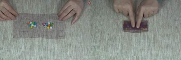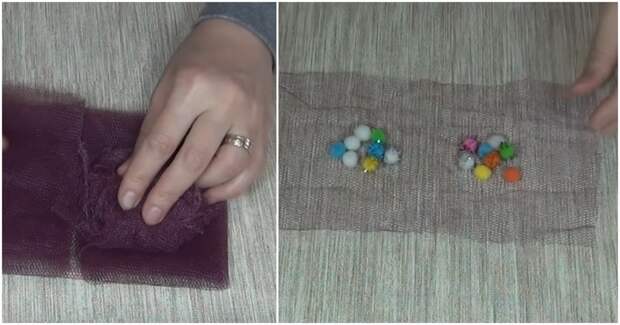 Чтобы сделать такую милую вещицу потребуется совсем маленький лоскуток фатина и крошечные цветные помпончики, которые продаются в магазинах для творчества. Положите цветные шарики примерно на средней линии лоскута, накройте краями ткани внахлёст сверху и снизу, боковые срезы загните к центру и зафиксируйте клеевым пистолетом.